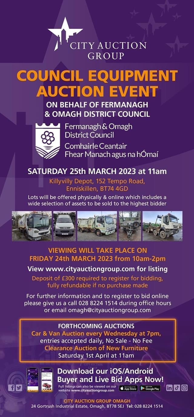 We are delighted to announce a very exciting auction event this Saturday 25th March 2023 at 11am on the premises of Fermanagh and Omagh District Council at their Killyvilly Depot, Tempo Road, Enniskillen.