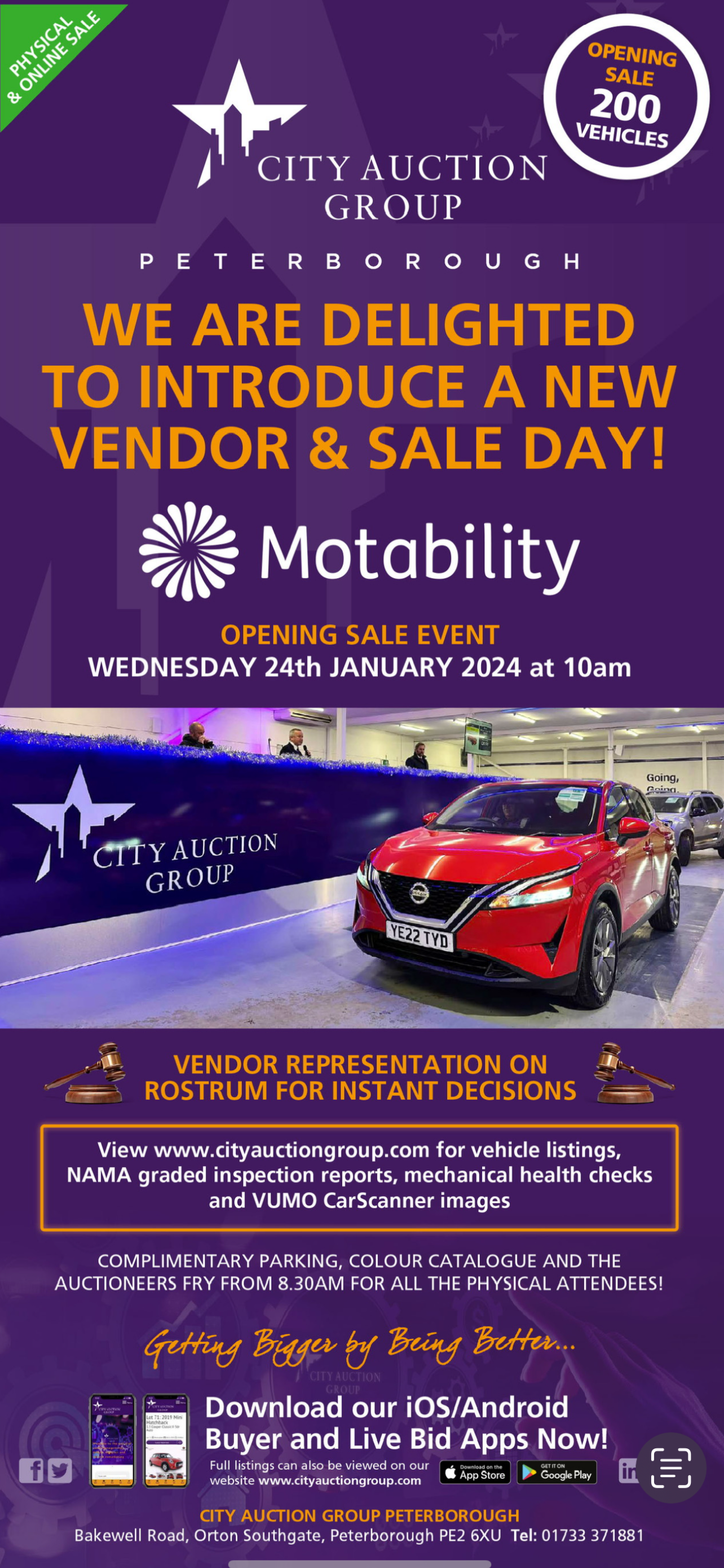 Michael Tomalin CEO stated ‘Motability will offer 400 vehicles monthly at our Peterborough centre and we are delighted they are joining our expanding network of valued corporate vendors. We are gaining huge momentum at Peterborough and this opportunity will enable our approved motor trade account clients across the UK and Northern Ireland the opportunity to purchase more vehicles both in the auction lane supported by live online availability’.